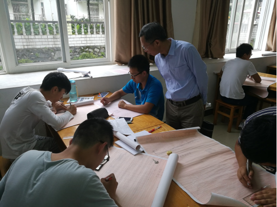 胡祥云院长在查看学生们绘制地层实测剖面图件情况